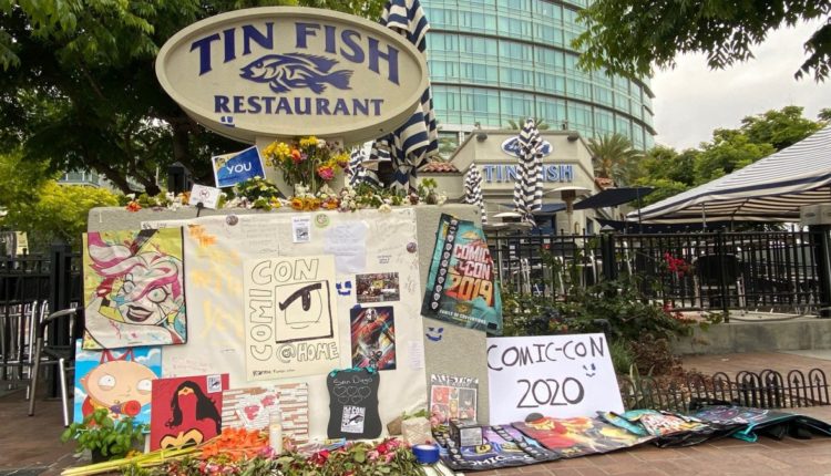 Comic-Con fans have created a shrine outside the Tin Fish restaurant to honor SDCC which was moved online due to the pandemic.
